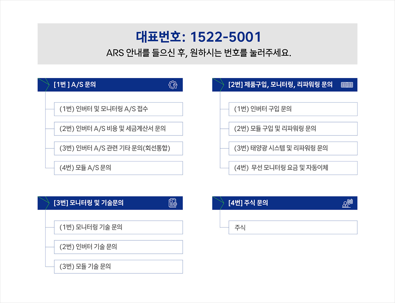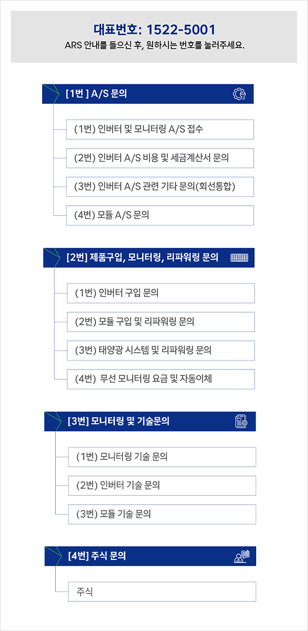 인버터 : 알람 코드 및 파손 사진, 발전소명/주소, 모델 및 수량, 납품일자, 담당자 연락처, 접수 정보를 함께 전달해주시면 보다 신속한 처리가 가능합니다.